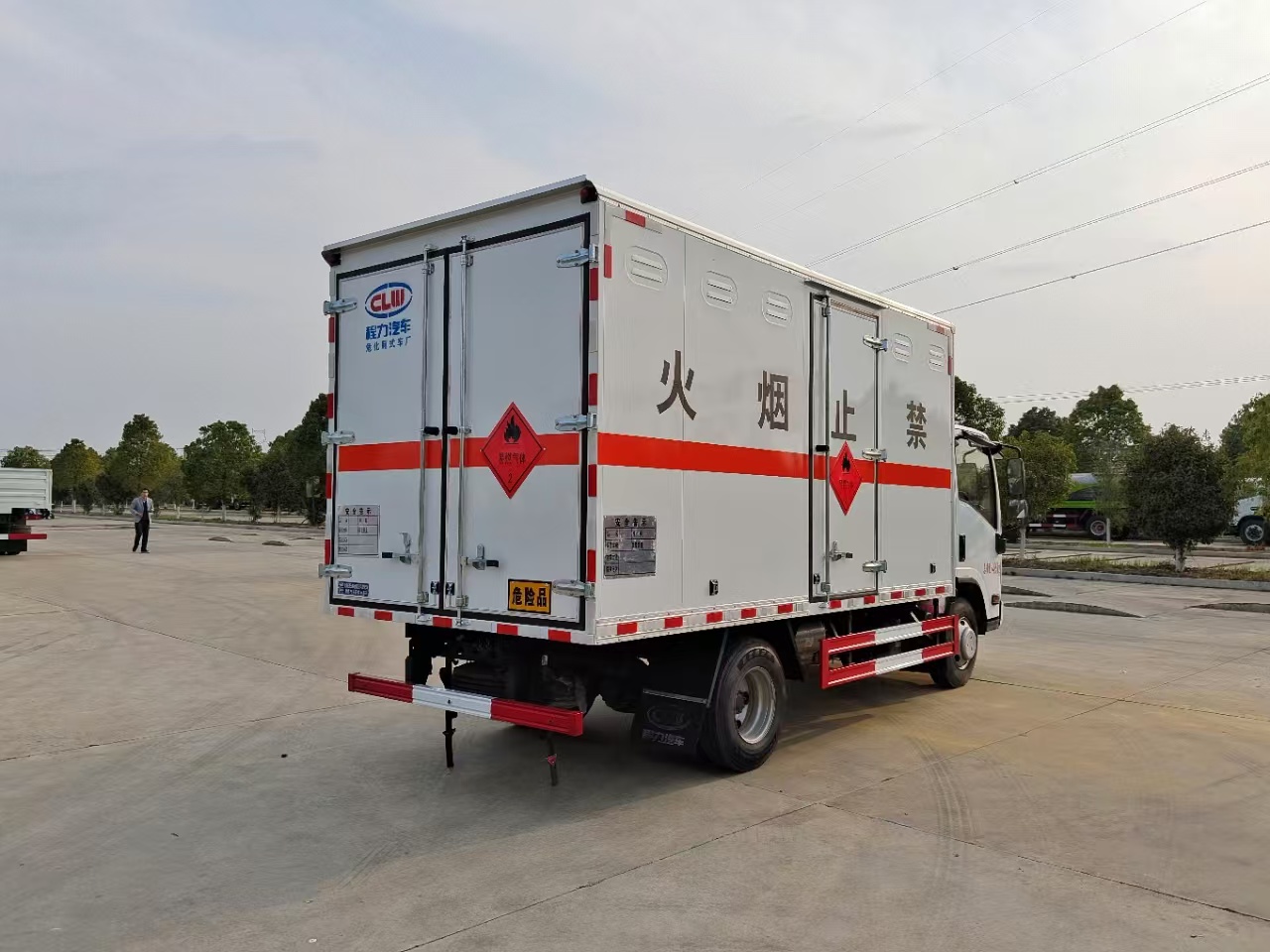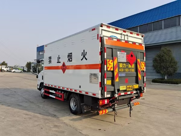 | 貨箱配置 | 廂體為雙層金屬骨架結(jié)構(gòu),外板采用冷軋鋼板,中間填充阻燃泡沫,內(nèi)飾為鋁板。底板為平板上鋪防靜電膠皮。廂內(nèi)兩側(cè)加裝固定貨物臥環(huán),門框帶防盜報(bào)警器,頂部帶煙霧報(bào)警器,廂體右側(cè)選裝側(cè)門,隨車配2個(gè)滅火器,危險(xiǎn)標(biāo)志牌,防火帽,危險(xiǎn)品三角頂燈。(選裝瓦楞板貨箱) (尾部可選裝液壓升降尾板) | ||