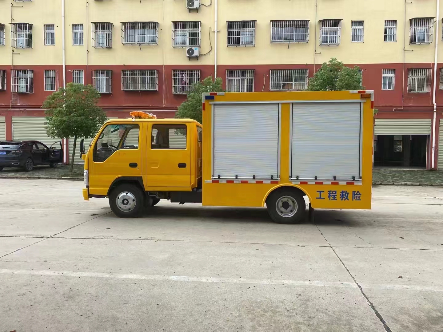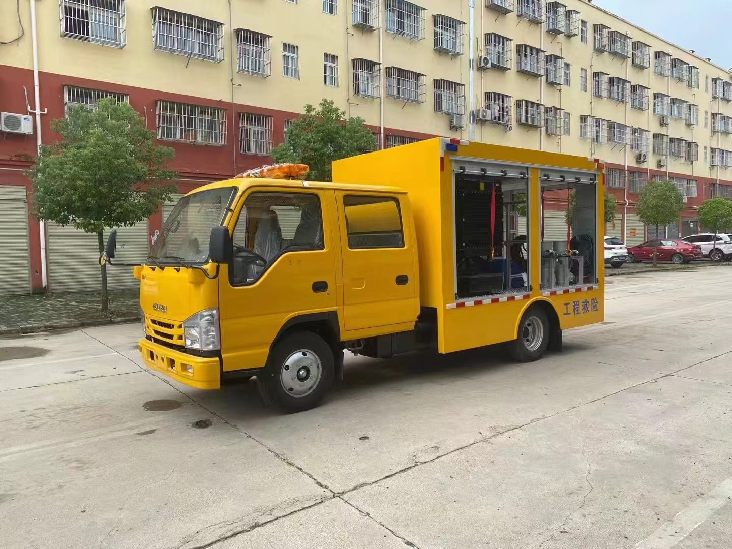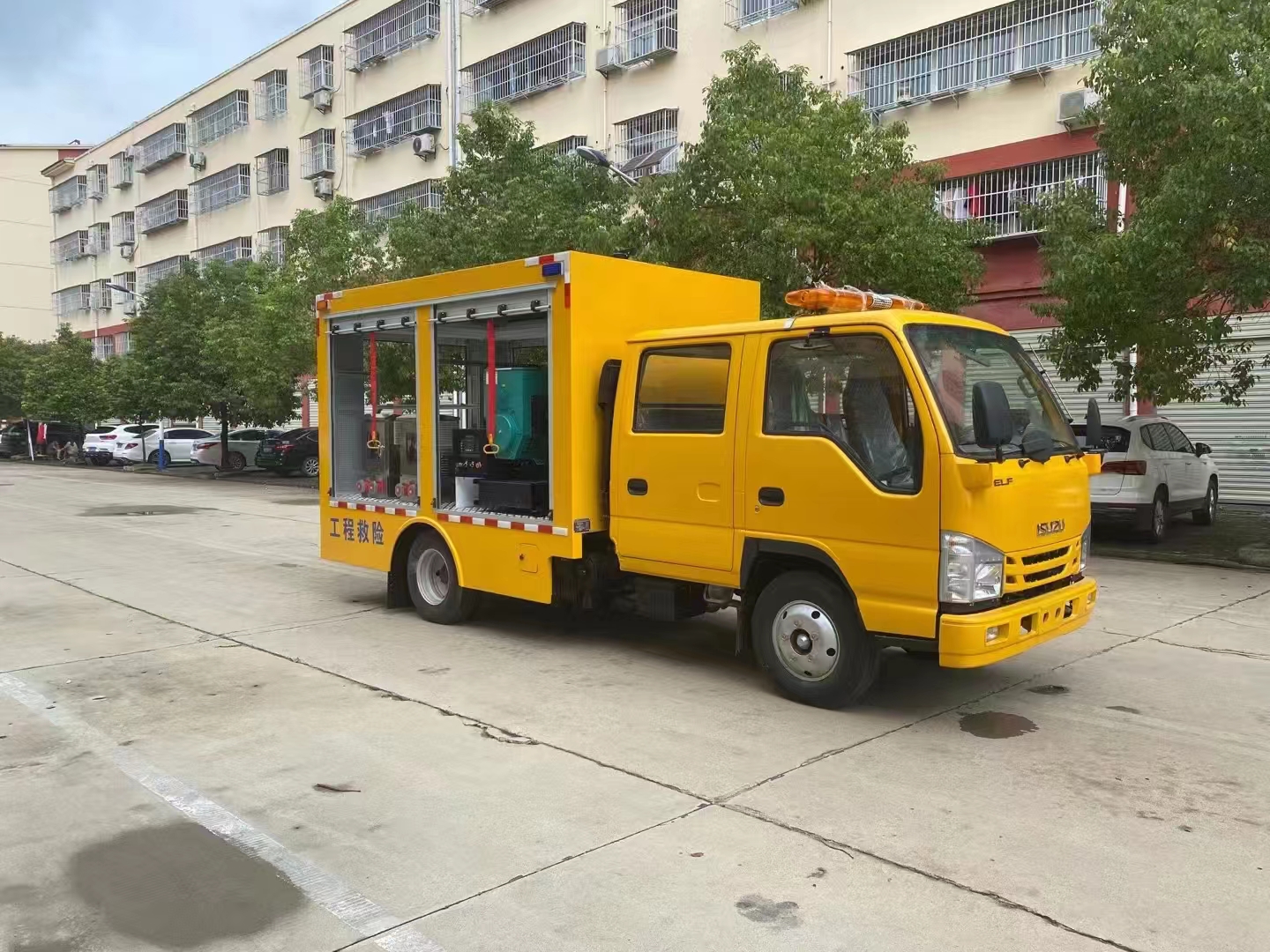 | 上裝配置 | 車箱一體式全封閉車箱車箱有隔音功能,廂體防火,阻燃,防雨,防塵,防銹,降噪,隔震,長期抗震結構,廂體外觀按照公告外觀制作,左右卷簾門,尾部是卷簾門,廂內安裝LED作業(yè)燈,作業(yè)燈帶獨立開關,底板采用花紋板。配備康明斯50KW發(fā)電機組,2臺功率22KW便攜式超輕型高速潛水泵,單臺水泵流量可達500m³/h,單泵配40米排水管(20米/根),水管直徑 DN200mm,水管材質為滌綸長絲編織。配有升降照明燈,升降燈可通過無線和有線遙控兩種方式控制,升降燈升降高度為1.2米,可水平旋轉。帶接地樁和接地電纜線,便攜泵控制柜,潛水泵浮圈,長排警燈,倒車影像,配兩只手提式干粉滅火器2只。其余為標配… | ||